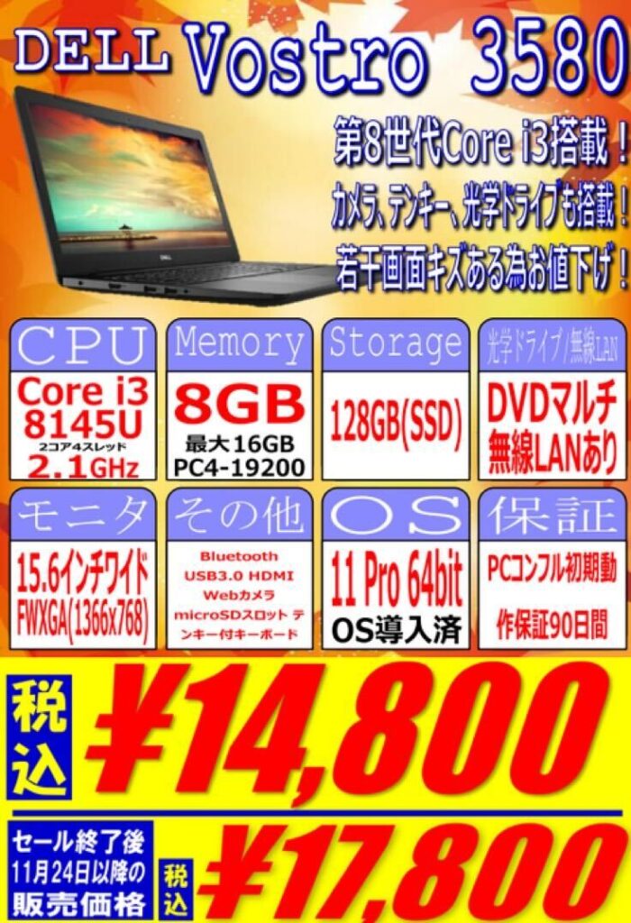 第8世代Core i3搭載、 8GB / 128GB SSD、15.6インチワイドFWXGA、Windows11 proという構成で14,800円です。