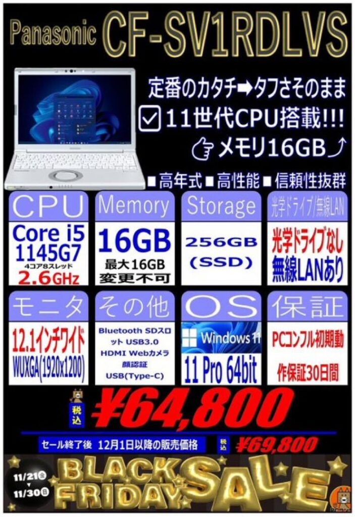 第11世代Core i5搭載、16GB / 256GB SSD、14インチワイドWUXGA、Windows11 Proという構成で64,800円です。