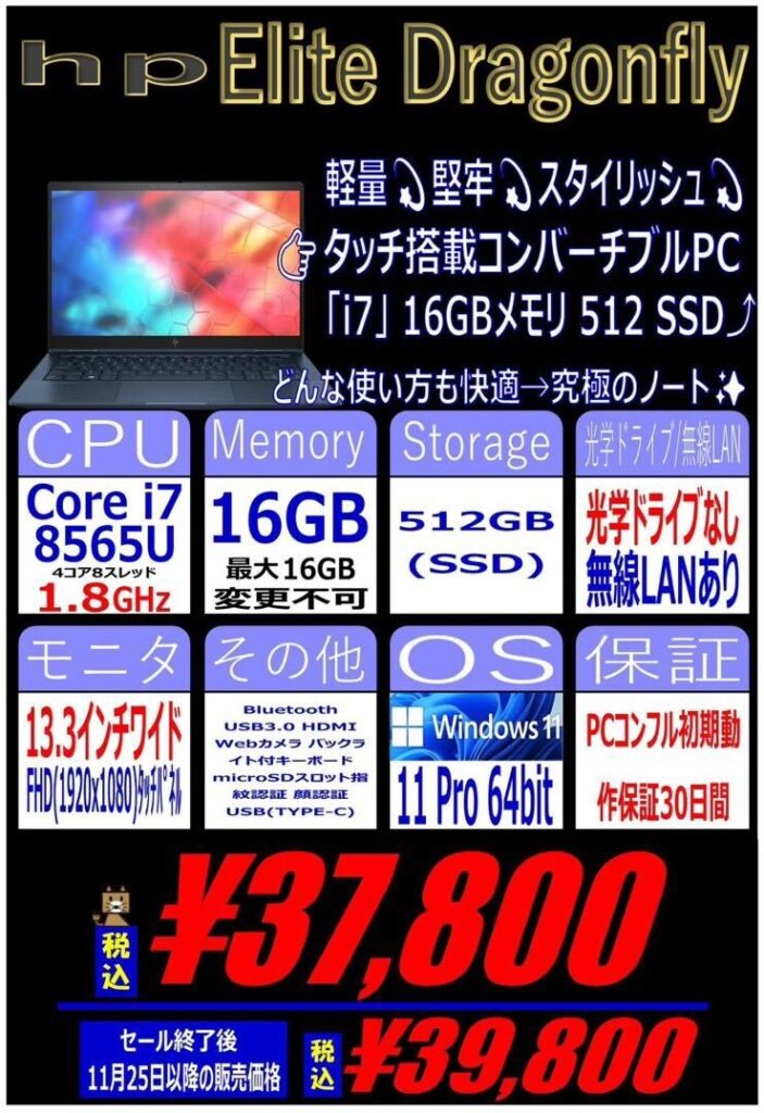 第8世代Core i7搭載、16GB / 512GB SSD、13.3インチワイドFHDタッチパネル対応、Windows11 Proという構成で37,800円です。