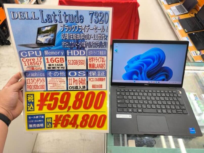 第11世代Core i7搭載、16GB / 512GB SSD、13.3インチワイドFHD、Windows 11 proという構成で59,800円です。