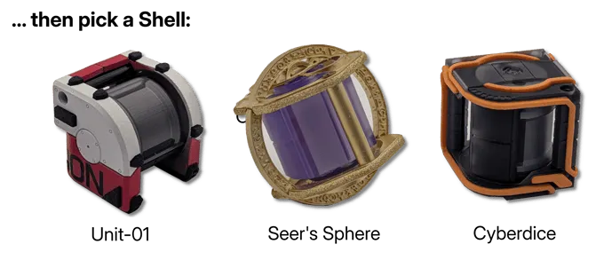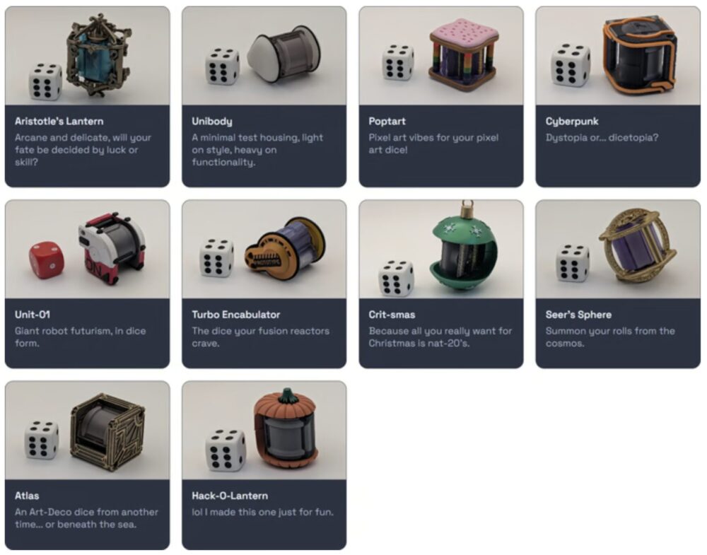 『Revolution Dice』は、ハードウェアとしての完成度だけでなく、ユーザーによるカスタマイズ性(Modding)にも重きを置いています。製品は電子部品を収めた「コア(Core)」と、外装となる「シェル(Shell)」の2パーツで構成されており、シェルは自由に交換が可能です。中世ファンタジー風のダンジョンデザインや、サイバーパンクな都市デザインなど、ゲームの世界観に合わせて着せ替えができる設計となっています。