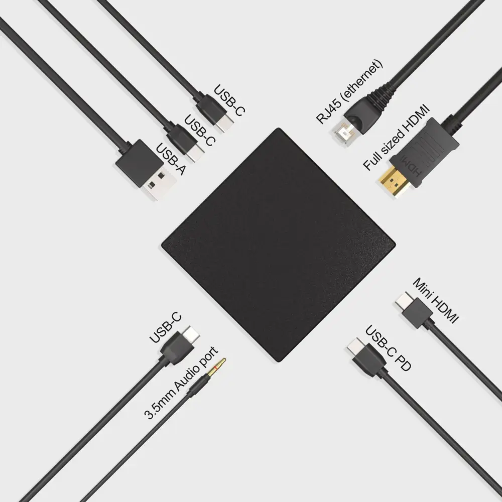 本製品が提供する合計8つのポートは、モバイルデバイスの作業効率を飛躍的に向上させます。前面には3.5mmヘッドホンジャックを配置し、オーディオ環境を確保。側面にはUSB Power Delivery(PD)に対応したUSB-Cポートを備え、ハブ機能を使用しながらの急速充電に対応します。