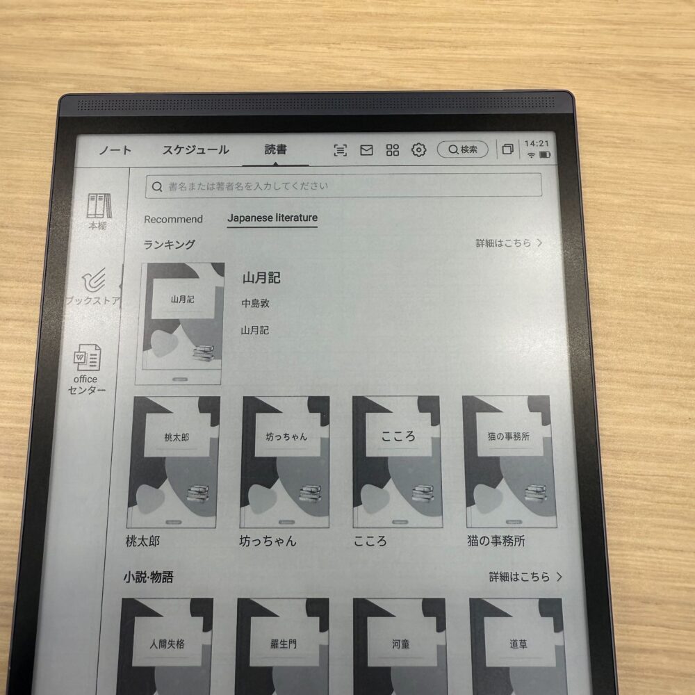 太宰治などの日本文学から、有名どころの海外文学までが標準で用意されています。