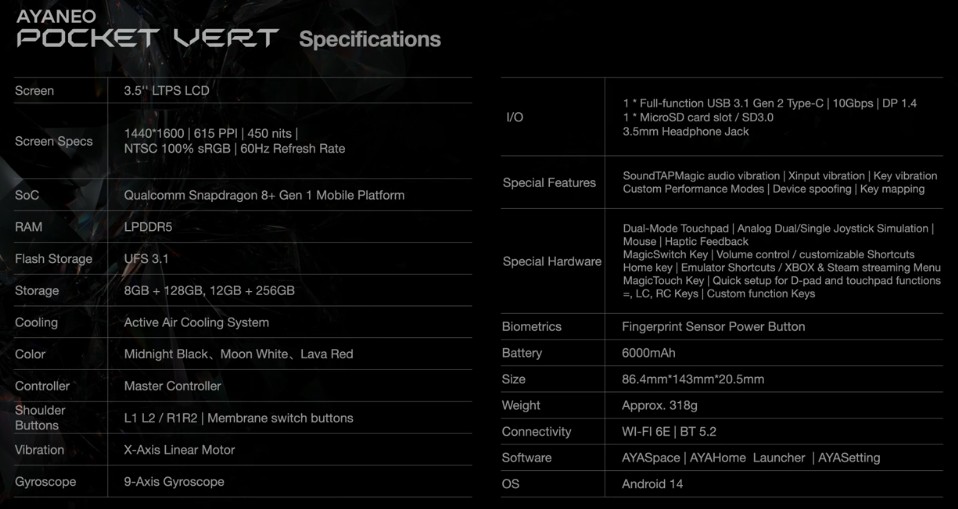 Ayaneoが新型縦型ゲーミング機「Pocket Vert」の正式仕様を公開しました。Snapdragon 8+ Gen 1搭載や3.5型高精細ディスプレイ、Android 14採用など、同社の縦型プレミアムモデルとしての全貌が明らかになっています。