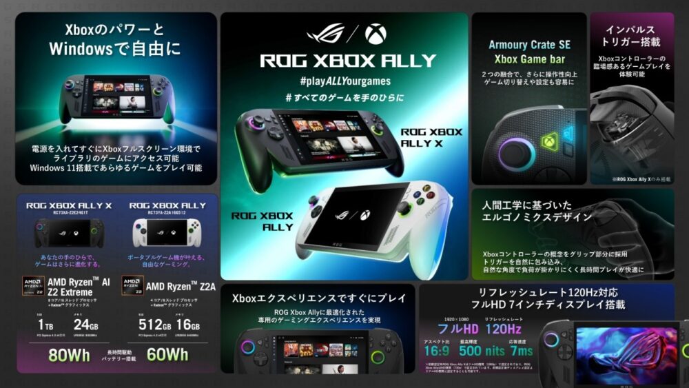 ASUS JAPANは、ROGブランドの最新ポータブルゲーミング端末「ROG Xbox Ally」および「ROG Xbox Ally X」を2025年10月16日に発売すると発表しました。両モデルともWindows 11 Homeを搭載し、Xboxボタンやインパルストリガーを含むフルサイズの操作体系を備えています。