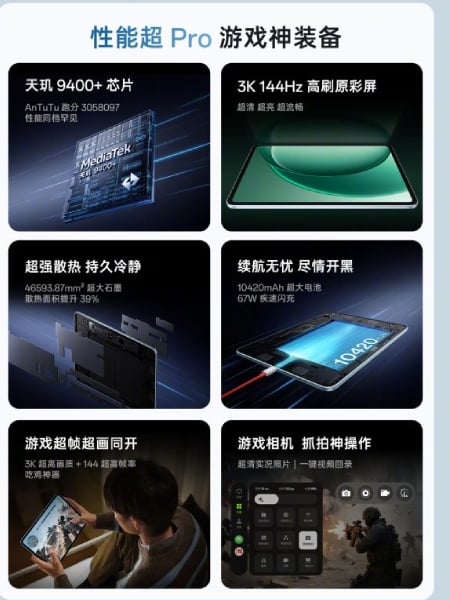 OnePlus Pad 2 dibekali chipset MediaTek Dimensity 9400+, prosesor kelas flagship dengan skor AnTuTu lebih dari 3,05 juta. Chip ini dipadukan dengan sistem pendingin uap (vapor-cooling) berukuran besar yang mencakup lebih dari 46.000mm², menjaga suhu tetap stabil bahkan saat bermain game berat atau multitasking.