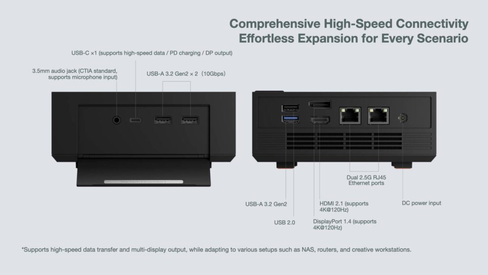 一方で、背面に配置されているのは2基の2.5GbE LANポート、DisplayPort 1.4、HDMI 2.1、電源ジャックなどに加え、USBポートは低速なUSB 2.0とUSB 3.2 Gen 2が各1基のみです。つまり、高速なUSB機器を常時接続しようとすると、前面のカバーを開けたままにする必要があり、ケーブルが前面から伸びることで、本来のデザイン性が損なわれる可能性があります。