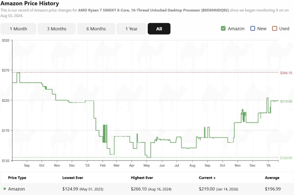 同様の現象は「Ryzen 7 5800XT」でも確認されており、現在のAmazon価格は219ドルです。こちらも2025年5月の最安値である125ドルと比較して、75%以上の価格上昇を記録しており、旧世代製品でありながら市場価値が反転上昇するという異例の事態となっています。