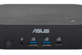 Na frente do aparelho, um painel basculante oculta as portas quando não estão em uso. Ao abrir essa tampa, o usuário encontra uma porta USB-C com suporte a vídeo, carregamento e dados, duas portas USB 3.2 Gen 2 Tipo-A e uma saída de áudio de 3,5 mm. O mini PC também conta com alto-falantes estéreo integrados, posicionados nas laterais do gabinete.