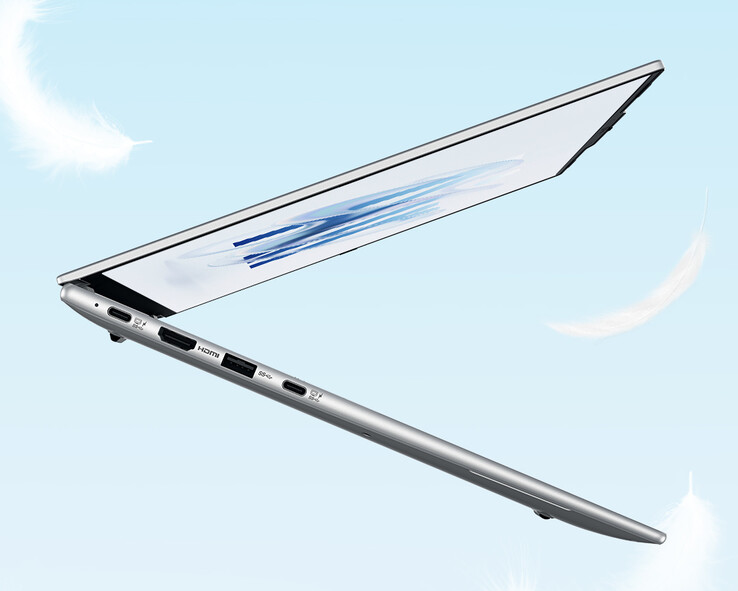O peso reduzido é resultado do uso de uma estrutura em liga de magnésio, mantendo a espessura em apenas 10 mm no ponto mais fino. A tela do tipo IPS possui resolução 2.5K e taxa de atualização de 120 Hz, priorizando uma boa experiência visual para uso diário.