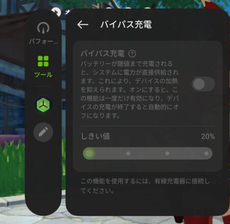プレイ中ではバイパス充電対応のため、優先して直接給電することで充電しながらのゲームプレイでも発熱負担を減らすことが可能です。