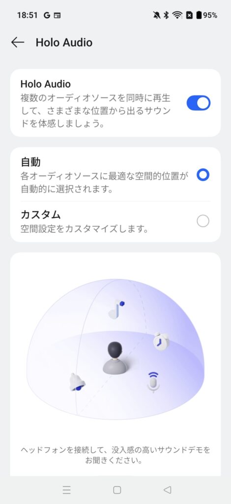 また、イヤホン接続時はHolo Audioで空間サウンドの体験が可能です。個人の好みに合わせた空間設定のカスタマイズも可能となっています。