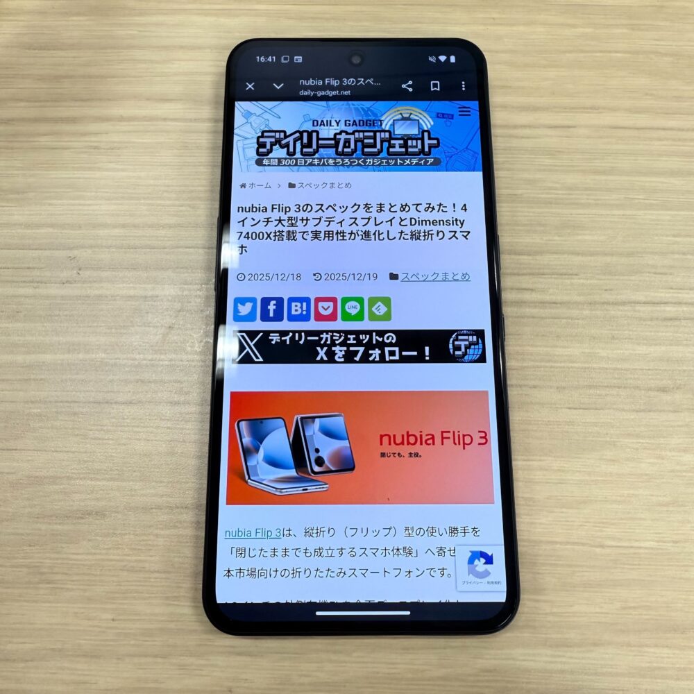 最大輝度は3,000ニトと非常に高く、屋外の直射日光下でも画面ははっきりと視認できます。リフレッシュレートは120Hzに対応しており、スクロールや画面遷移は滑らかです。実際に使ってみても、有機ELらしい発色の良さとFHD+解像度の精細さが印象的で、価格帯を考えるとディスプレイ品質はかなり高いと感じました。