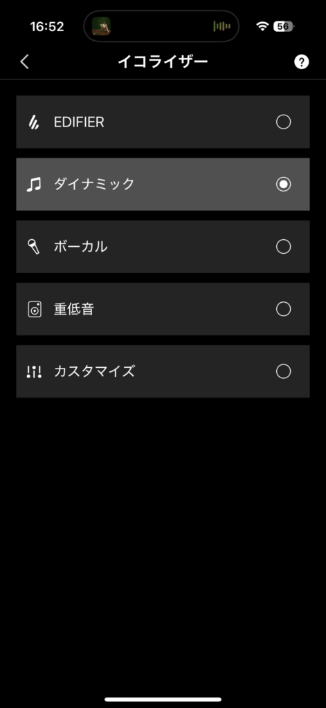 「ダイナミック」にして聴いてみると低音は豊かだが主張しすぎず、中高音はクリアで伸びやかな音に感じられました。
