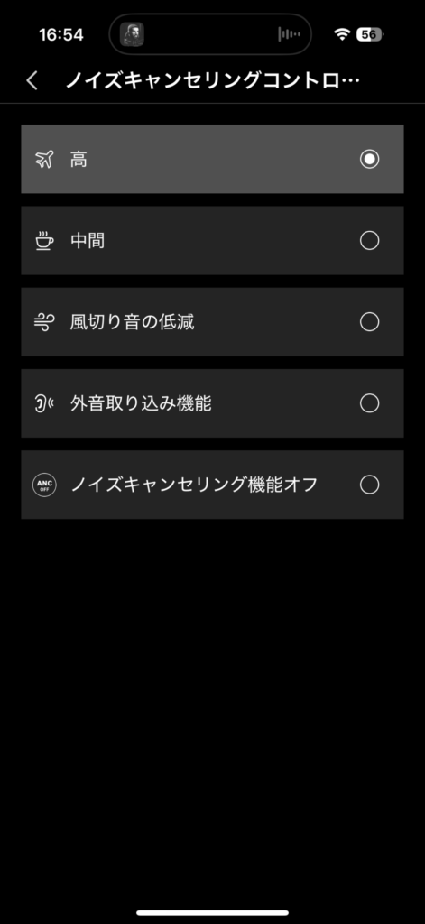 ノイキャンの強さを「高・中・風切り音の軽減」で調整できるのに加えて、外音取り込みも選択して調整できます。