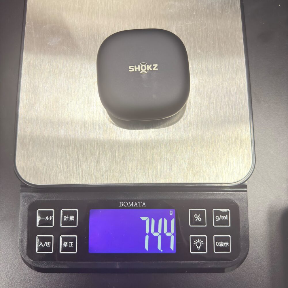 充電ケースも含めた総重量は実測で74.4gです。