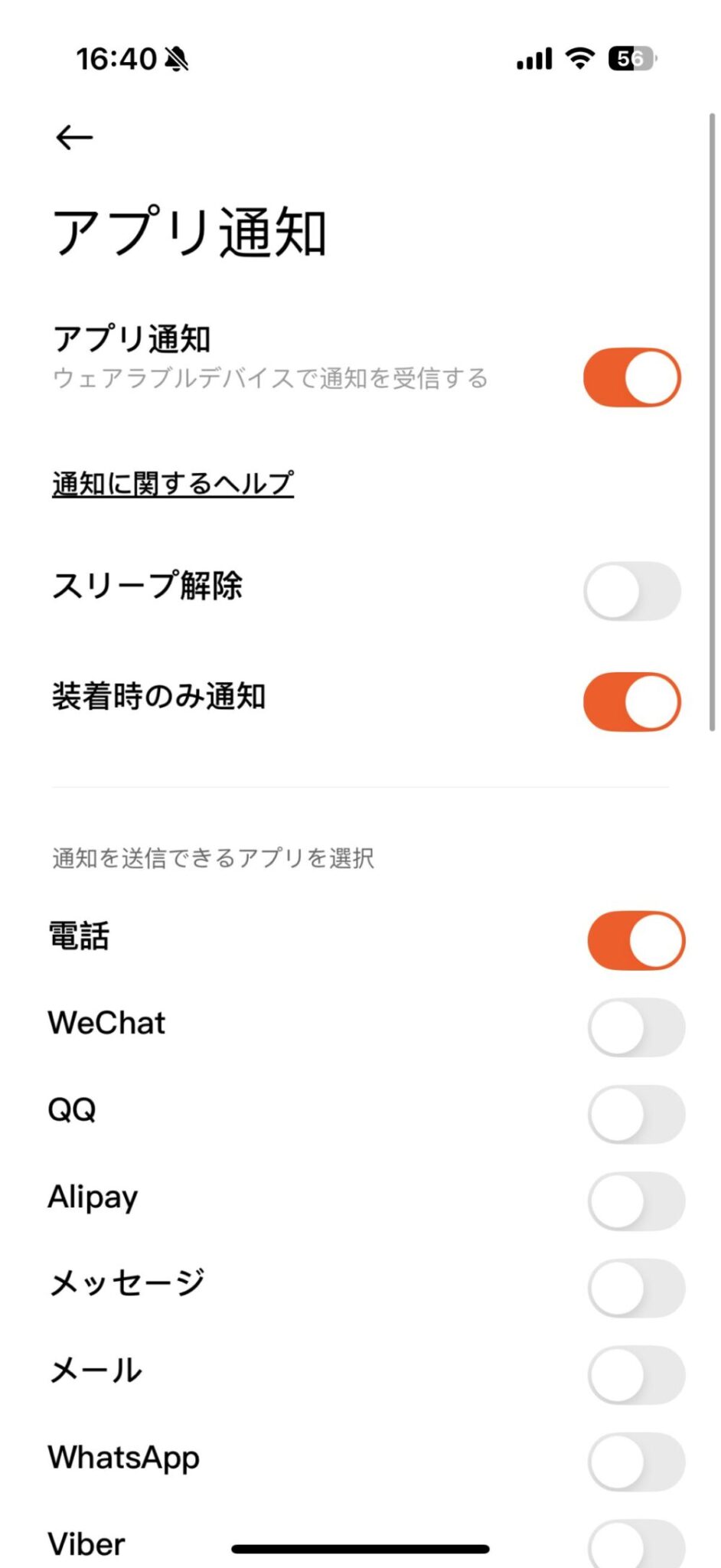 アプリの設定では、バンドで通知を受け取るかどうか?どのアプリの通知を受け取るか?といった設定が可能です。