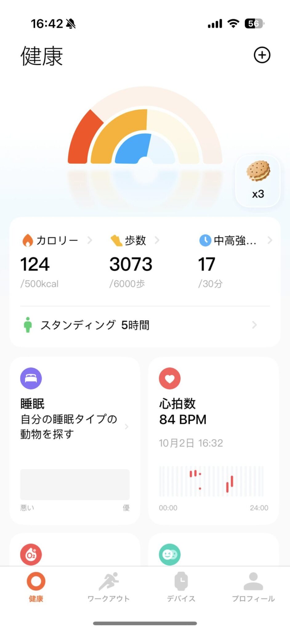 ただ、心拍数、血中酸素レベル、ストレスの3つの項目は24時間モニタリングが可能です。