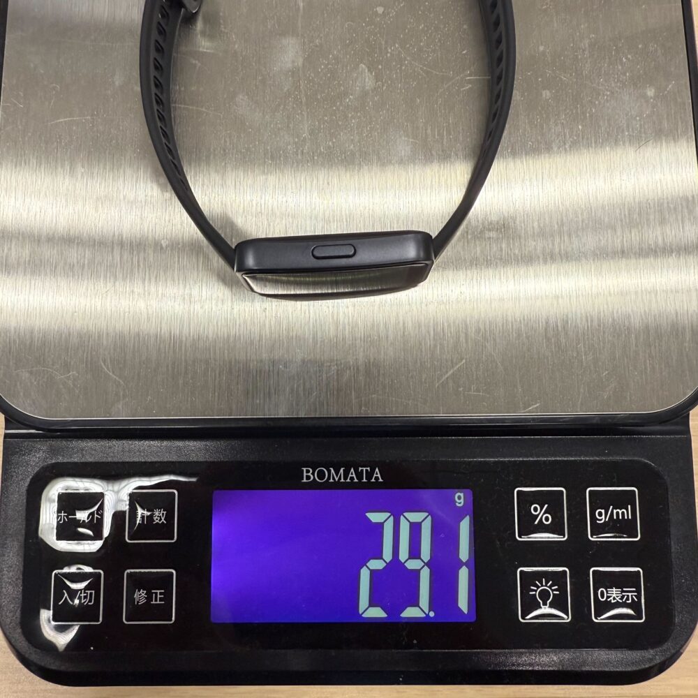 本体のみで約15g、バンド込みで約29gとなっています。