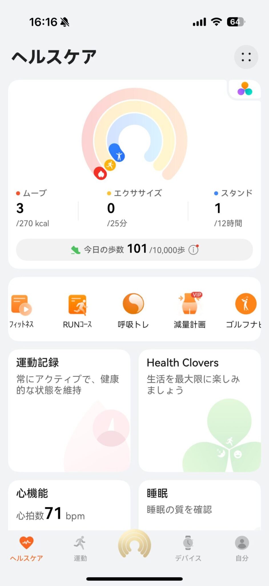 HUAWEI Band 10を装着しているだけで、歩数・距離・消費カロリー・睡眠・心拍・SpO2・情緒(ストレスレベル)を自動計測してくれます。