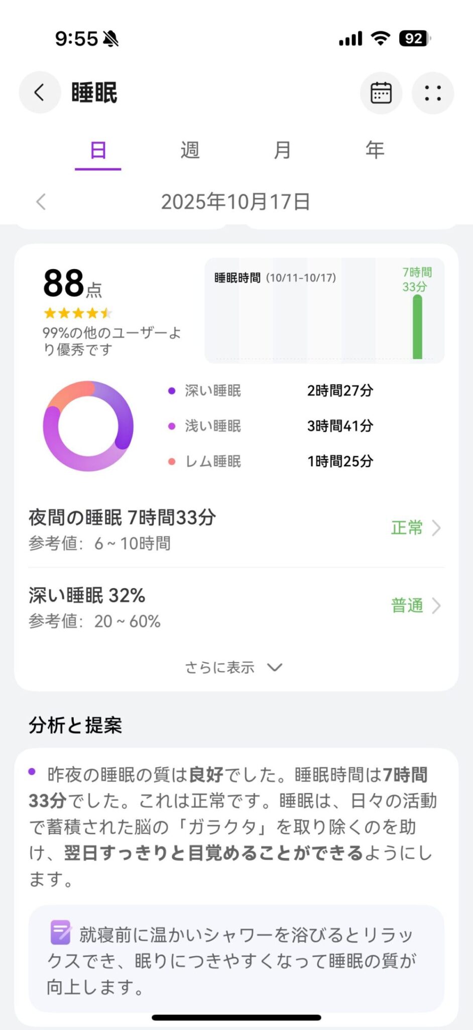HUAWEI Healthアプリを見れば、睡眠スコアだけでなく、睡眠の質を改善するためのアドバイスも表示されるので、自分の睡眠習慣を見直すきっかけになります。