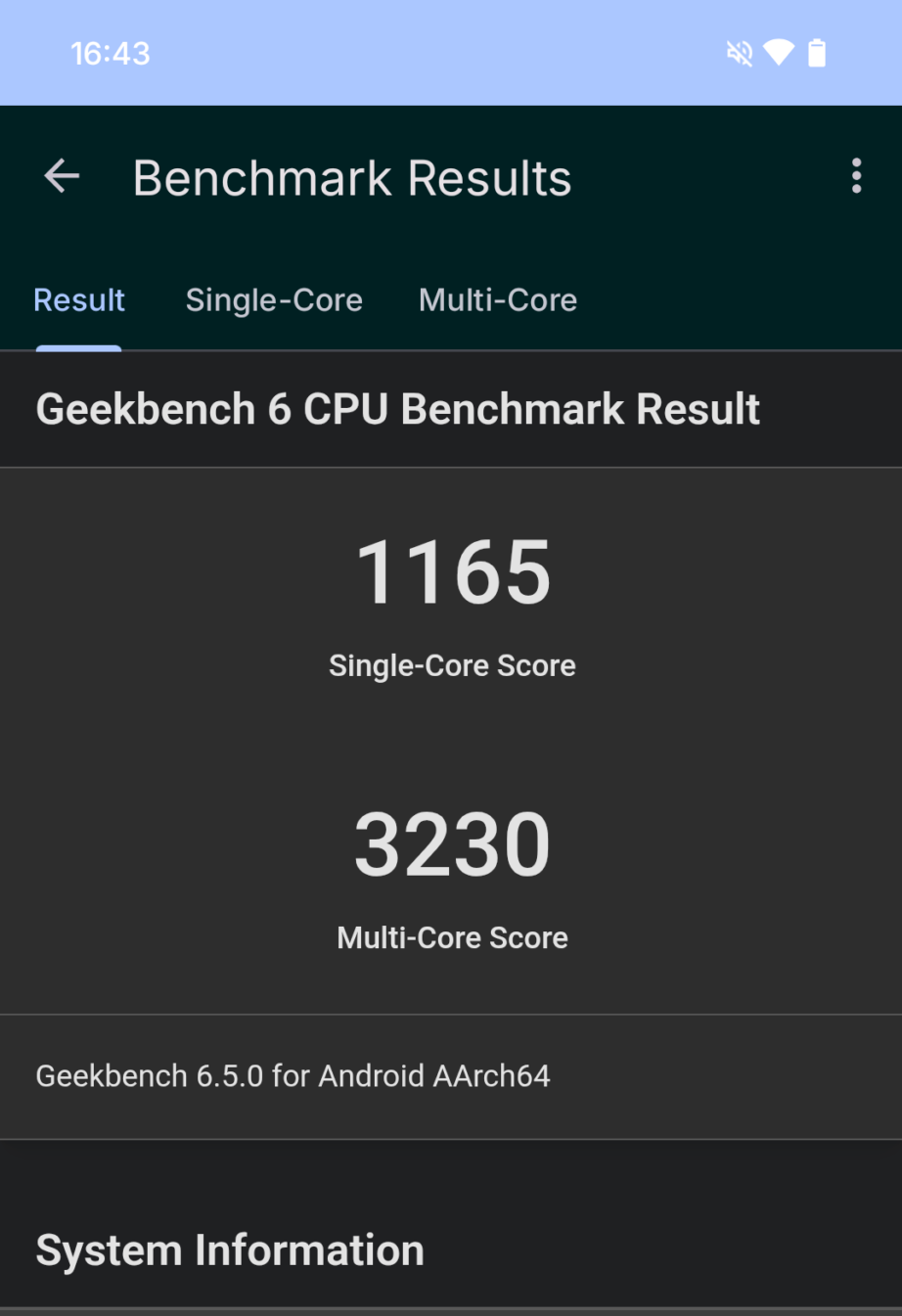 ベンチマークスコアはGeekbench 6によると、シングルコア1,165、マルチコア3,230でした。