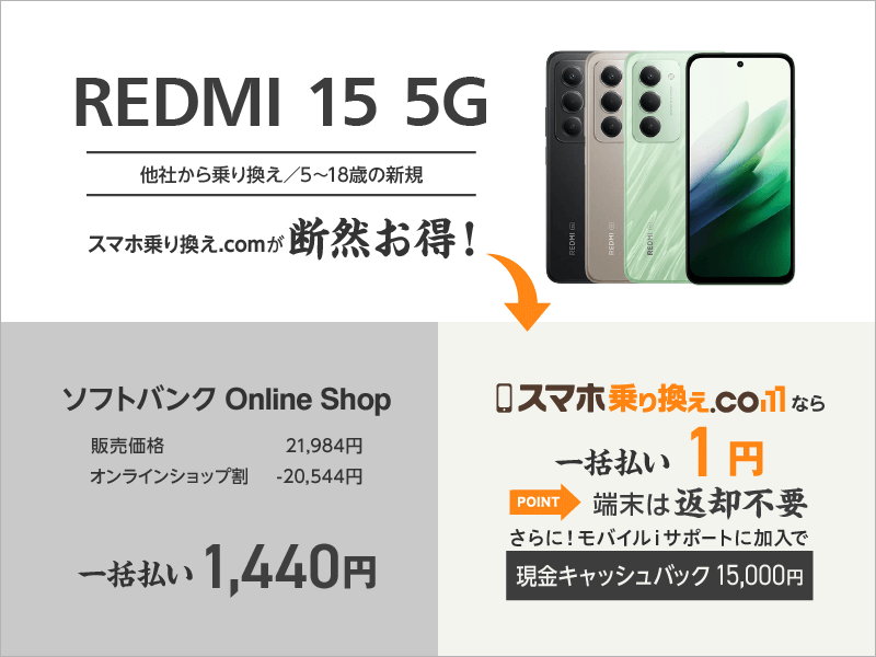 - 価格条件: 一括1円 + 現金15,000円キャッシュバック