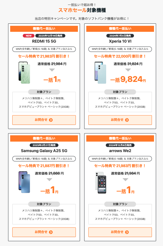 今回の施策は大きく分けて「人気シリーズ(iPhone/Pixel)」と「高コスパAndroid(一括1円枠)」の2軸で展開されています。
