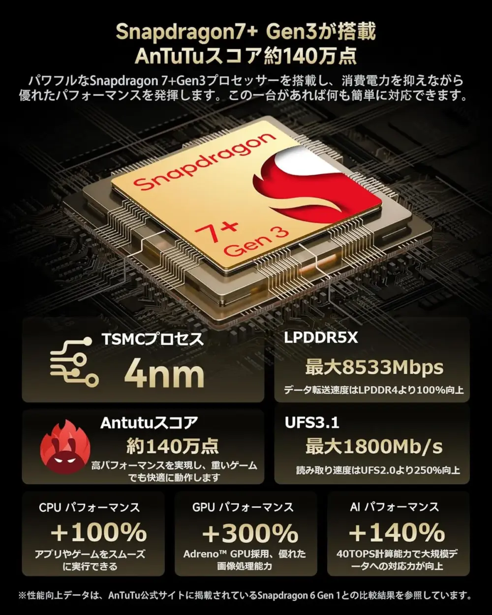 本製品の最大のトピックは、SoCに「Snapdragon 7+ Gen 3」を採用している点です。 AnTuTuベンチマークスコアは約140万点(公称値)に達し、これはハイエンド機「Lenovo Legion Y700 (2023)」に肉薄する数値です。従来の「iPlay 50/60 mini Pro」シリーズがHelio G99(約40万点)を搭載していたことを考えると、性能は3倍以上に跳ね上がっています。