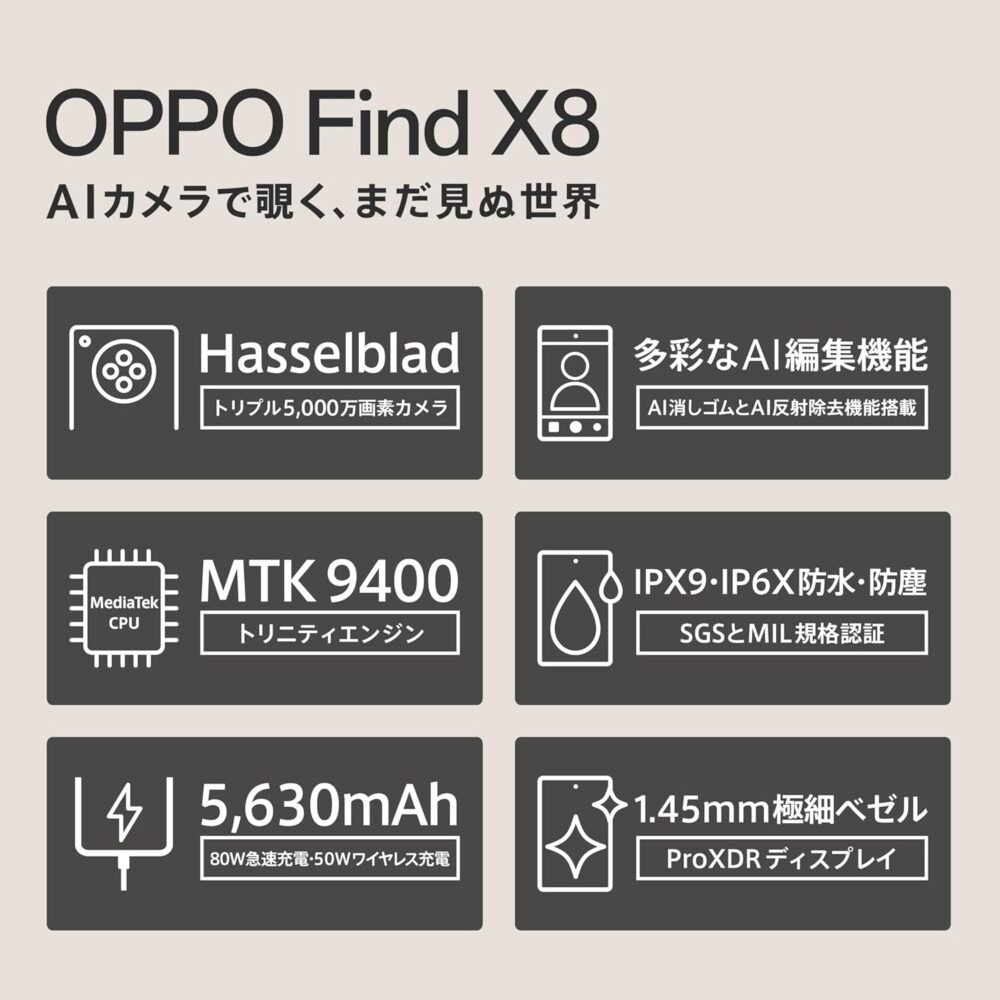 OPPO Find X8は、6.6インチ・2,760×1,256の高解像度AMOLEDディスプレイを採用したハイエンドスマートフォンです。画面占有率94.3%の極細ベゼル設計により、コンパクトなボディながら大画面を実現。Corning Gorilla Glass 7iを採用したフラットディスプレイは、湾曲がなく保護フィルムも貼りやすいため、実用性と美しさを両立しています。