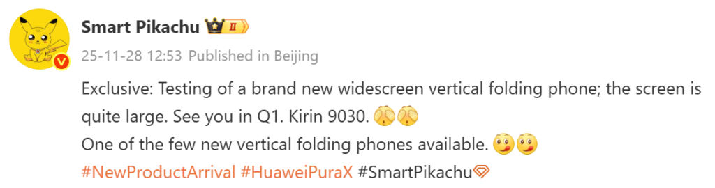 Weibo上でリーカー(Smart Pikachu氏)が共有した情報によると、Huaweiは現在、縦型のワイド画面フォルダブル端末「Pura X2」のテストを進めているとされています。発売時期は2026年Q1(1〜3月)頃と見られており、前モデルから約2年ぶりの後継機となります。