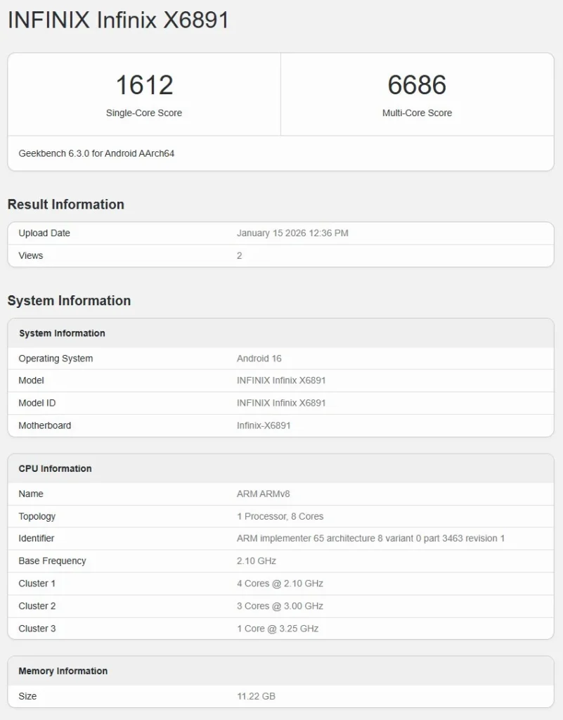 Geekbenchのスコアによれば、Infinix GT 50 Proはシングルコアで1,612ポイント、マルチコアで6,686ポイントを記録しています。この数値は、本機がMediaTek製の「Dimensity 8400 Ultimate」SoCを搭載していることを強く示唆しています。CPU構成は、最大3.25GHzで動作するプライムコアが1基、3.00GHzのパフォーマンスコアが3基、2.10GHzの高効率コアが4基の計8コア構成です。