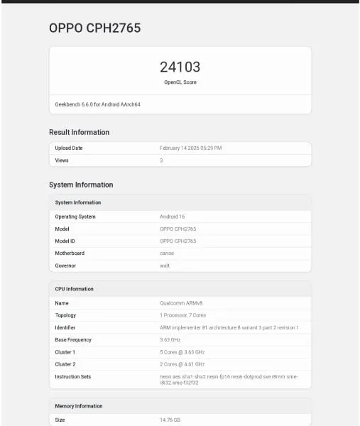 Geekbenchのデータによると、『Oppo Find N6』は最新のAndroid 16で動作し、メモリは16GBを搭載しています。搭載されるSoC「Snapdragon 8 Elite Gen 5」の構成は非常にユニークで、最大4.61GHzで動く高性能なプライムコアが2つ、3.63GHzのパフォーマンスコアが5つの、合計7コア構成となっています。通常のモデルよりも、パフォーマンスコアが一つ少ない設計です。