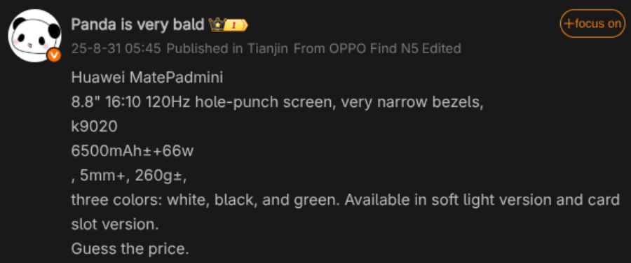Huaweiが新たな小型タブレット「MatePad Mini」を準備しているようです。中国SNS Weiboで信頼性の高いリーカー「Panda is very bald」氏によって、発表前に詳細スペックが明らかになりました。