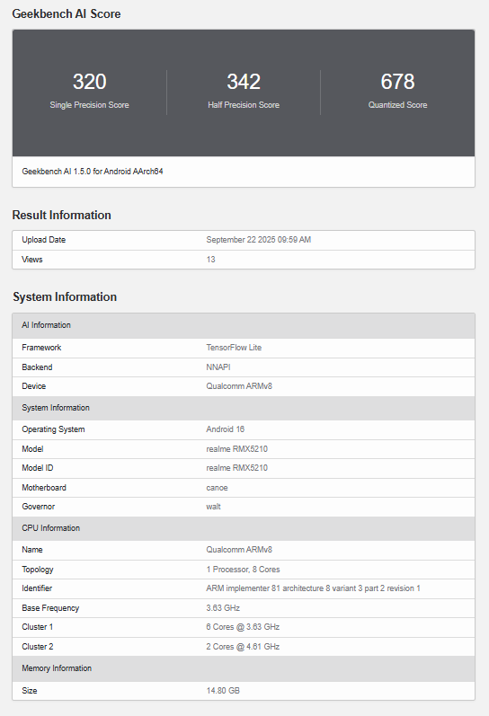Geekbench AIにおいて「RMX5210」という型番の端末が発見されており、これはRealme GT 8 Proと見られています。