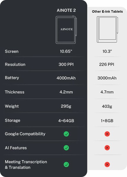 AInote 2は、厚さわずか4.2mm・重量約295gという軽量かつ薄型の筐体が最大の特徴です。10.65インチのE Inkディスプレイを採用しており、Remarkable 2(4.7mm)やRemarkable Paper Pro Move(6.5mm)など既存製品よりもさらに薄く設計されています。