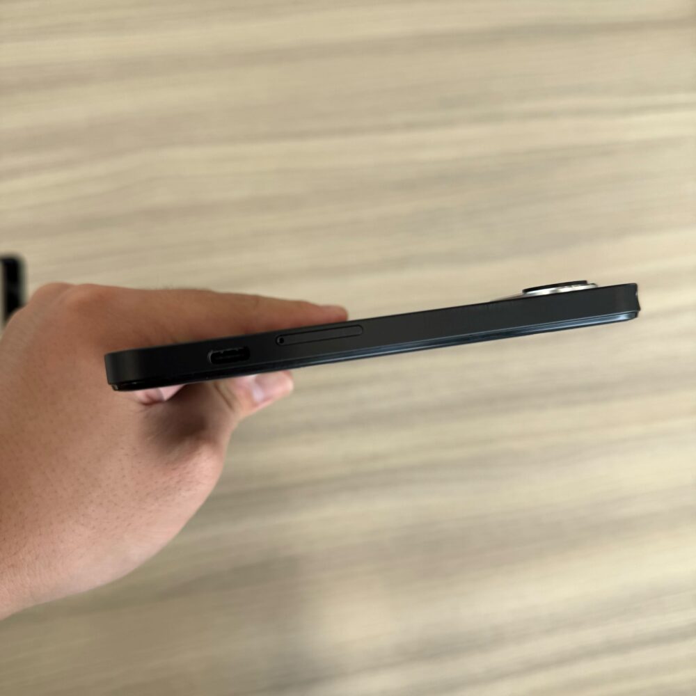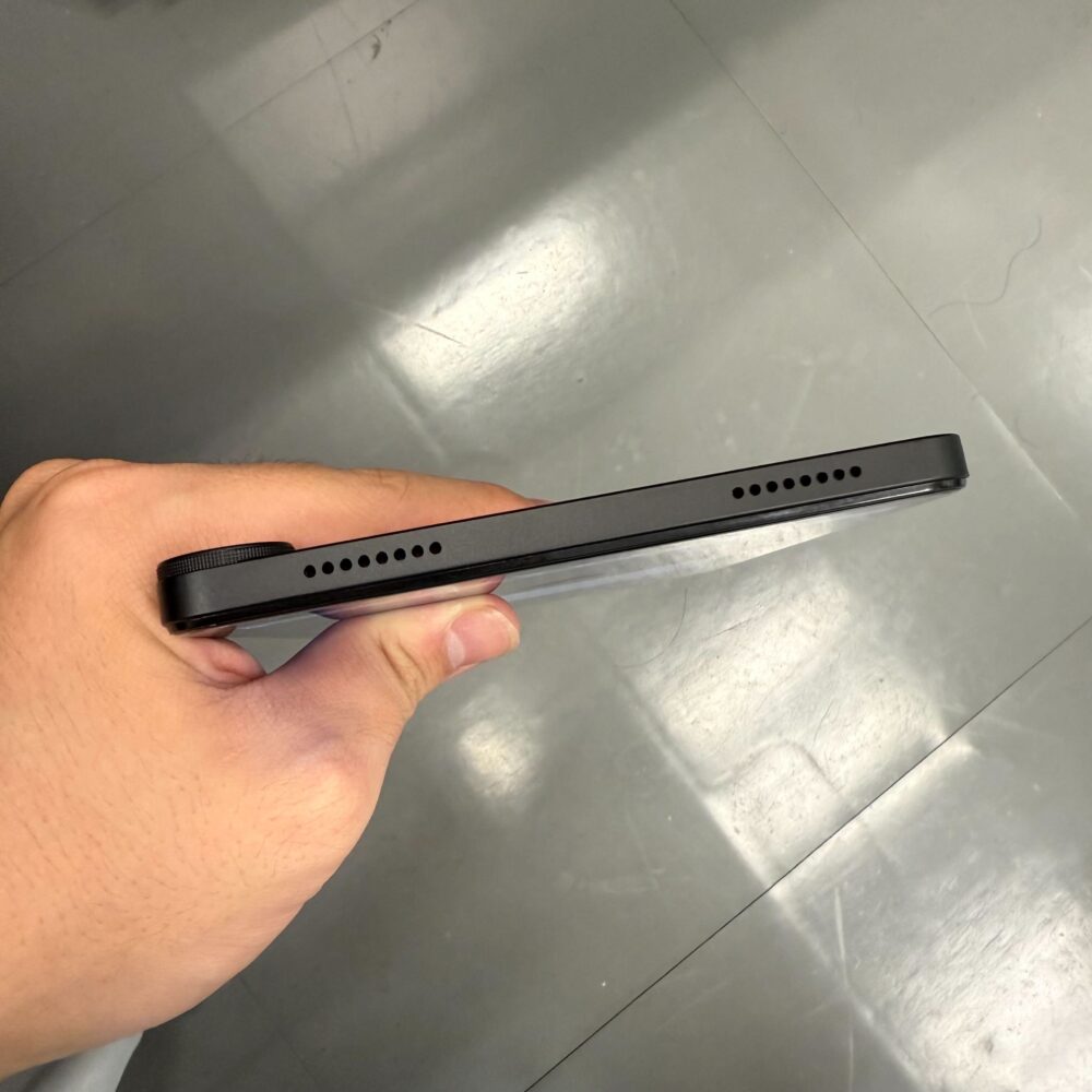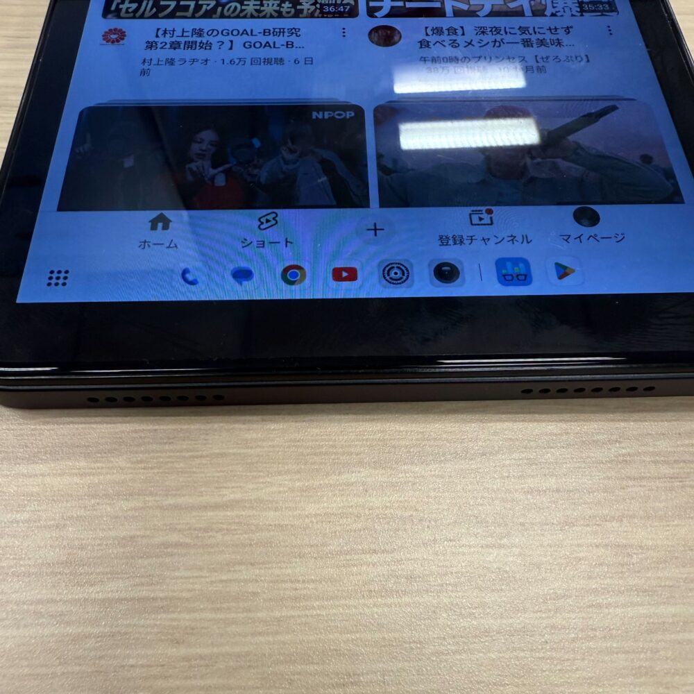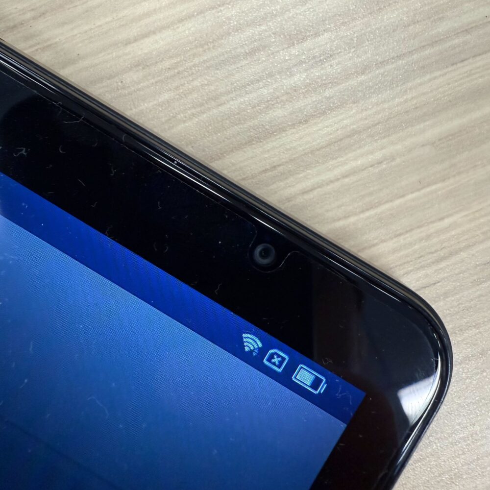 ベゼル(画面の縁)はやや厚めで、このあたりは好みが分かれるポイントです。最近はベゼルの細いモデルも増えていますが、持ちやすさや誤操作の少なさという点では、厚みがあることにも利点があります。見た目のスタイリッシュさを取るか、実用性を取るかは悩ましいところですね。