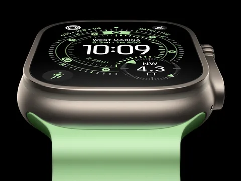 最上位モデルのApple Watch Ultra 3は、49mmのチタンケースを採用。新しいLTPO3有機ELディスプレイは最大3,000ニトの輝度を持ち、広視野角かつ常時表示に対応します。