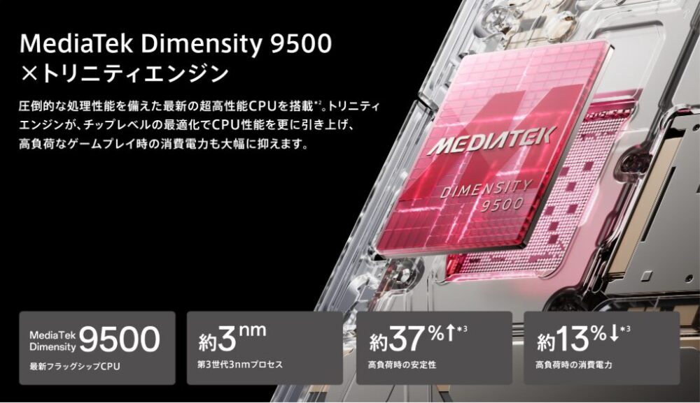 処理性能の中核を担うSoCには、MediaTekのDimensity 9500が採用されています。
