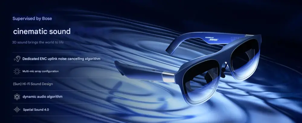 在聲音方面,Xreal 與 Bose 合作調校,支援 Spatial Sound 4.0,並搭載動態音訊演算法。裝置也加入 ENC 上行降噪演算法,強調具備「影院級音效」。但因為採用類似開放式耳機的設計,預期隔音效果不如入耳式 ANC 耳機。